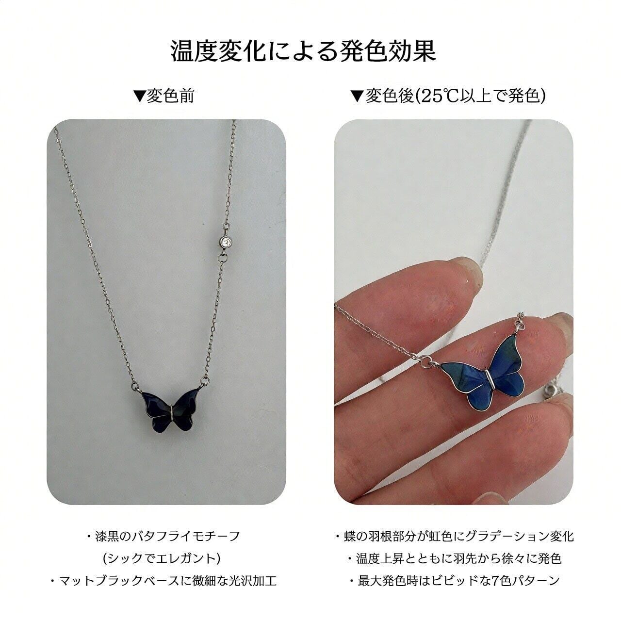 体温で色が変わる魔法の蝶 バタフライネックレスは、驚くほど美しいデザインとユニークな色変化が魅力です。身に着けることで、あなたの体温によって蝶の色が変わり、まるで魔法のような演出を体験できます。普段のコーディネートにぴったりのアイテムとして、個性を引き立てること間違いなし!