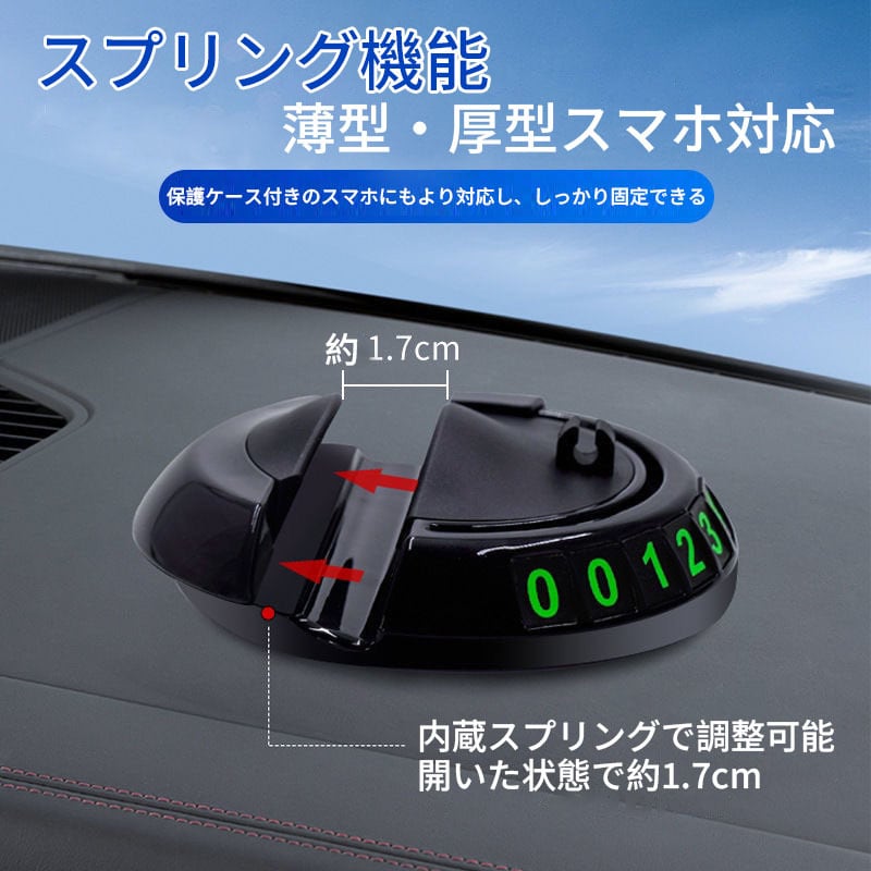 スマホスタンド・仮駐車番号・小物収納がこれ1つ。