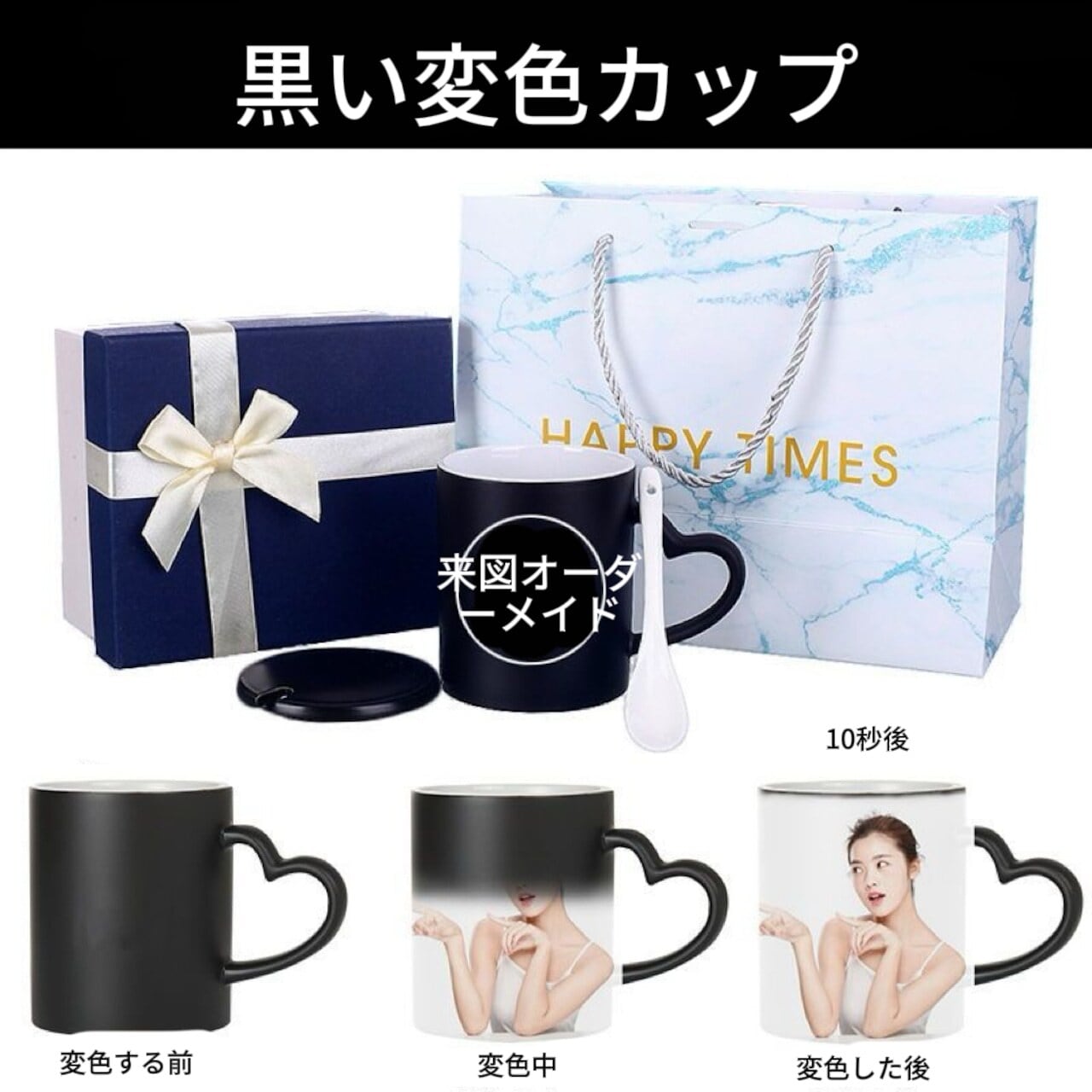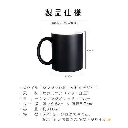 ■ 仕様:60℃以上のお湯を注ぐと写真が浮かび上がる温感変色仕様
