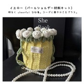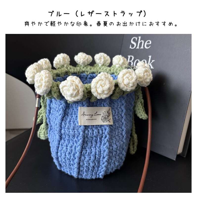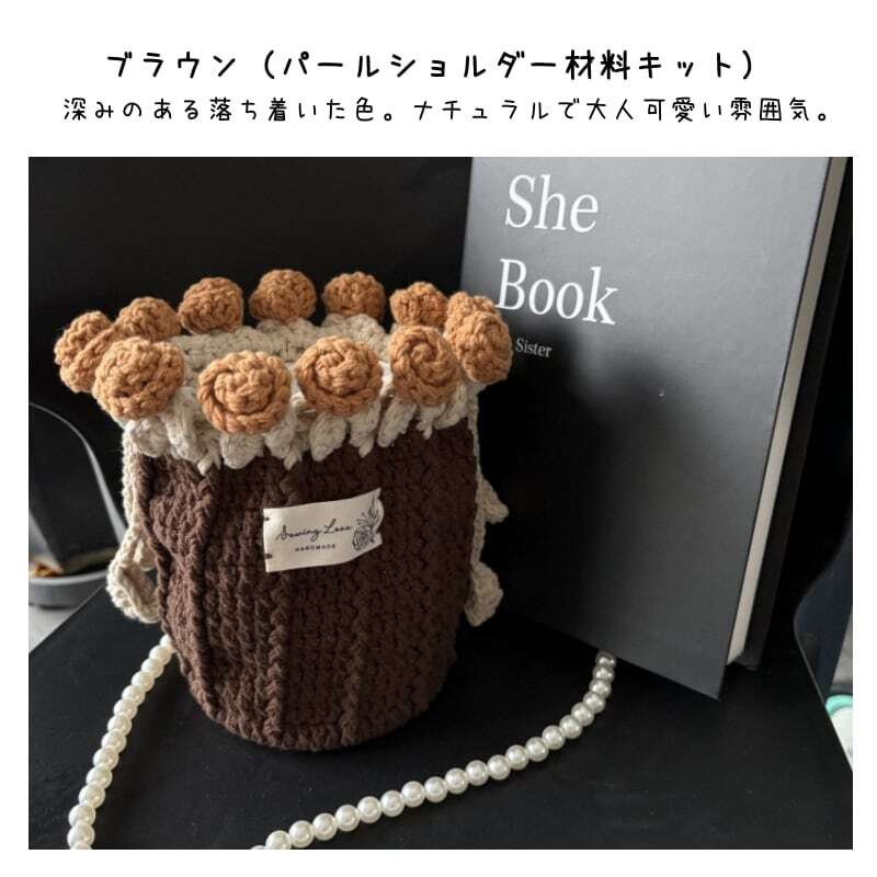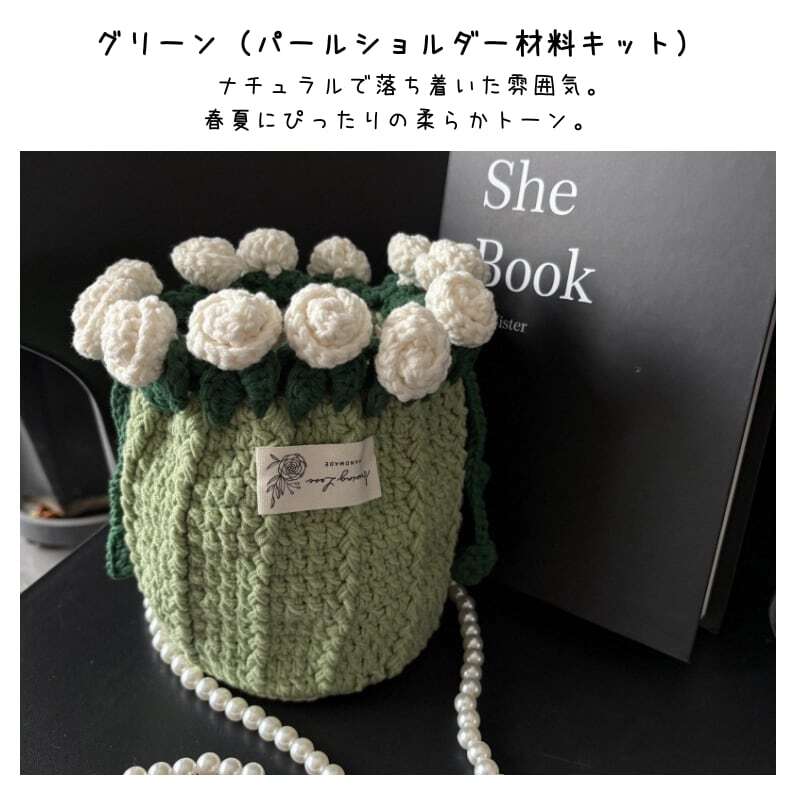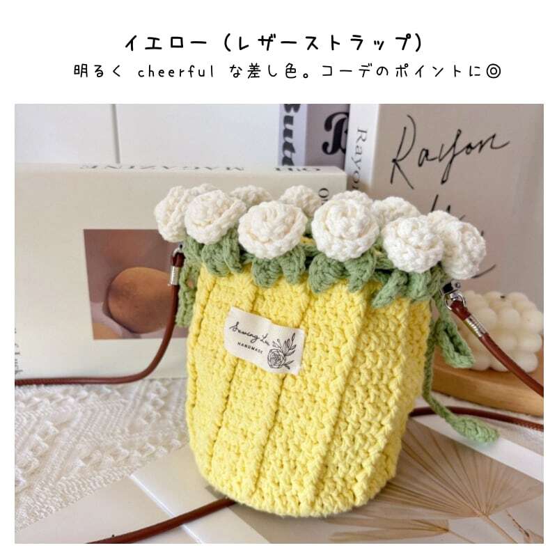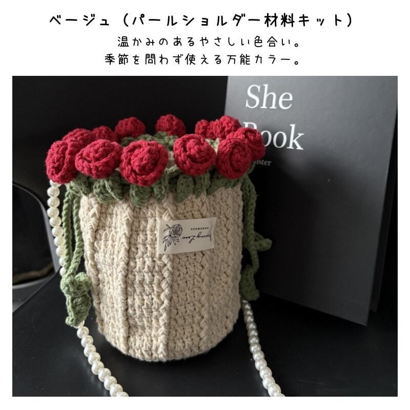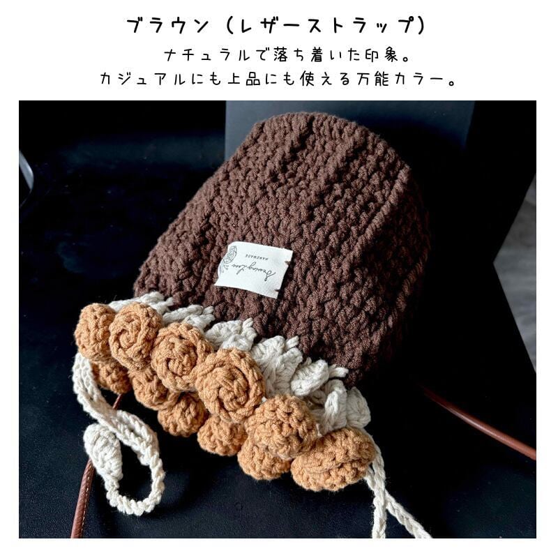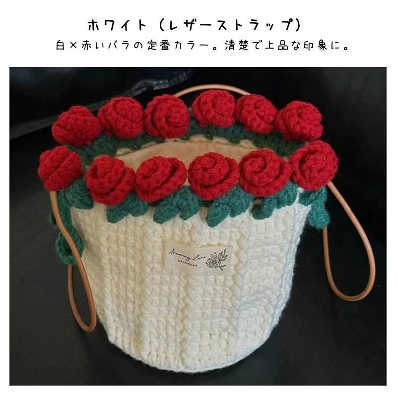 【期間限定特価】【ご購入特典】編み方動画レッスンプレゼント 手編みローズバッグ ハンドメイド毛糸ショルダーバッグ 花束デザイン巾着バッグ 材料キット パール&レザーストラップ全7色
