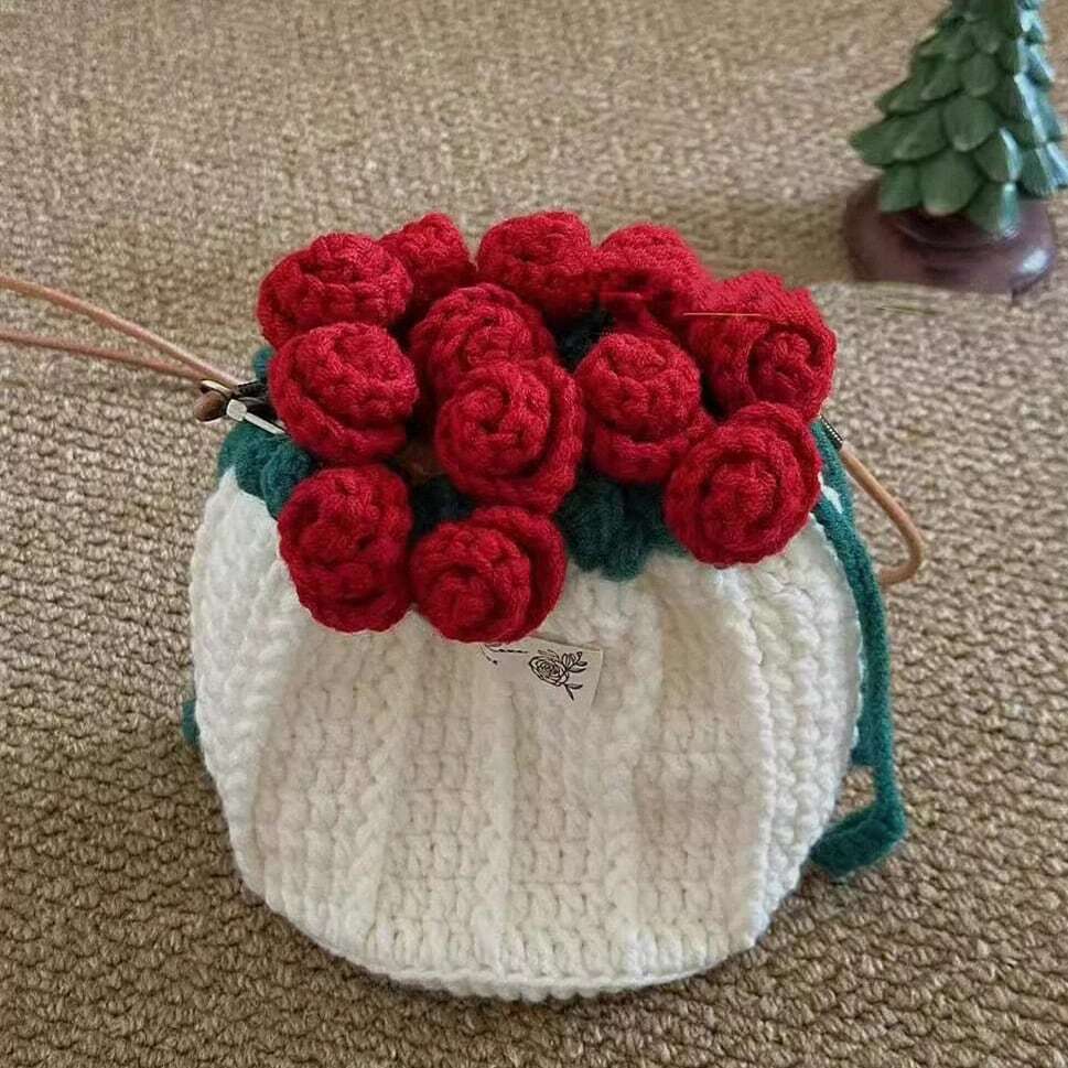 可憐な赤いバラが咲き誇るニットショルダーバッグ。