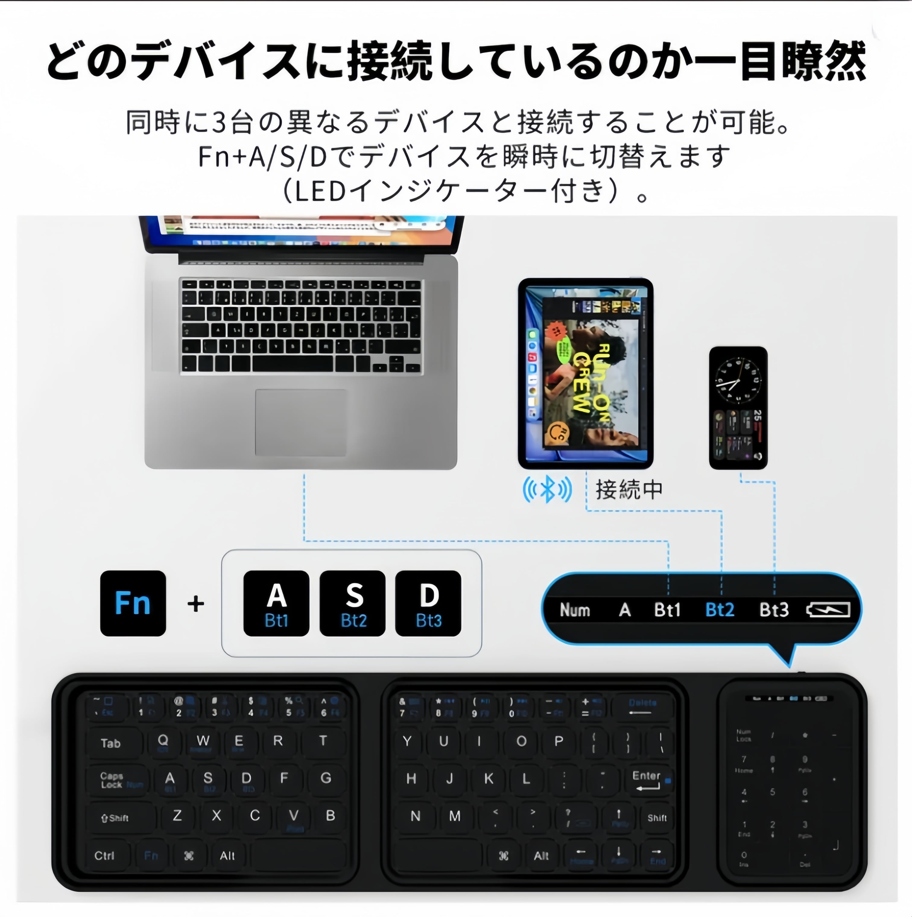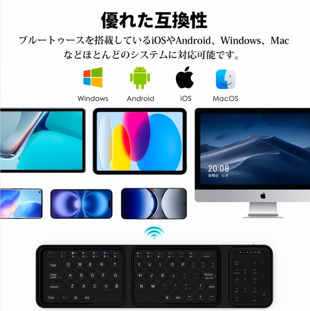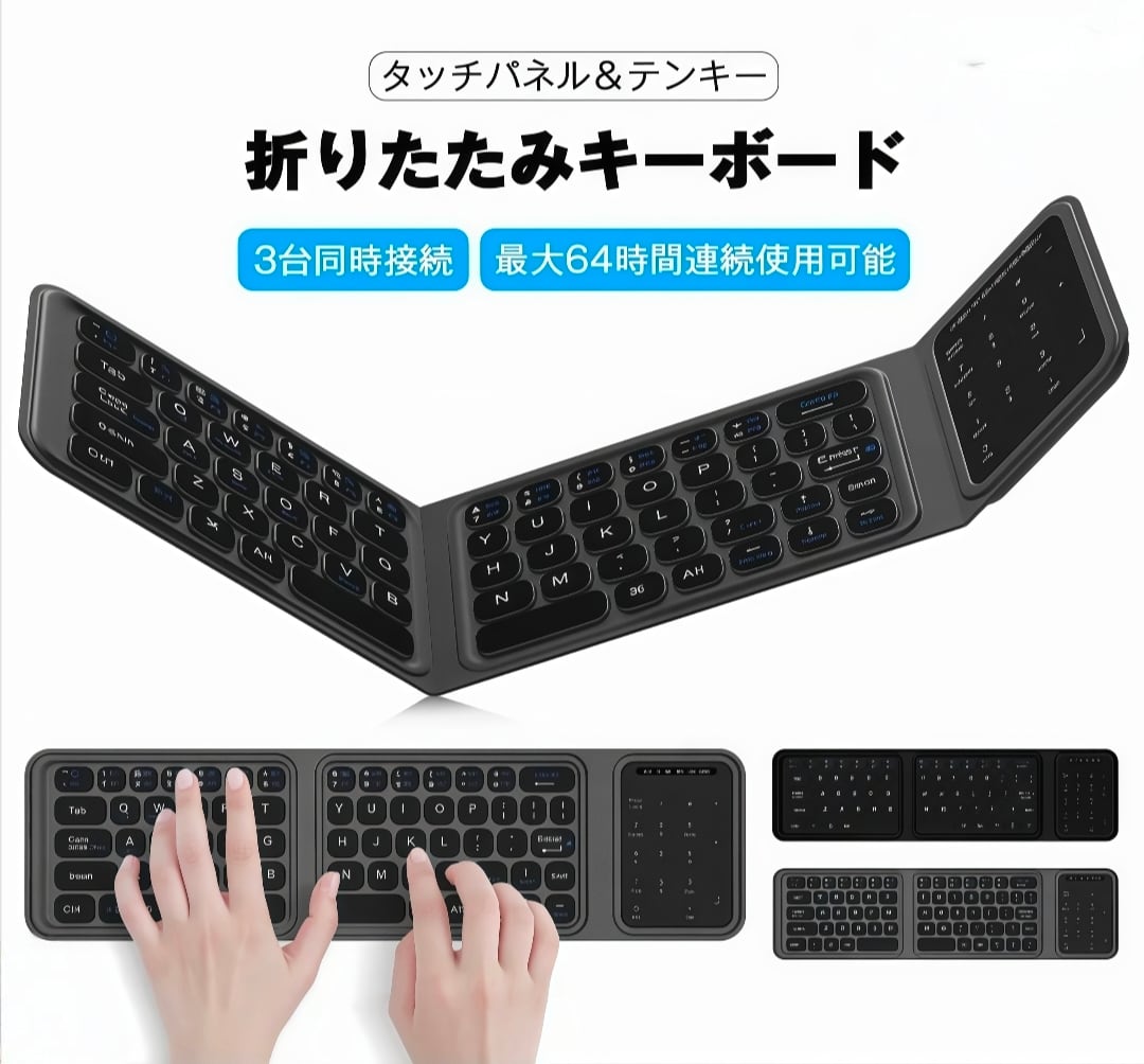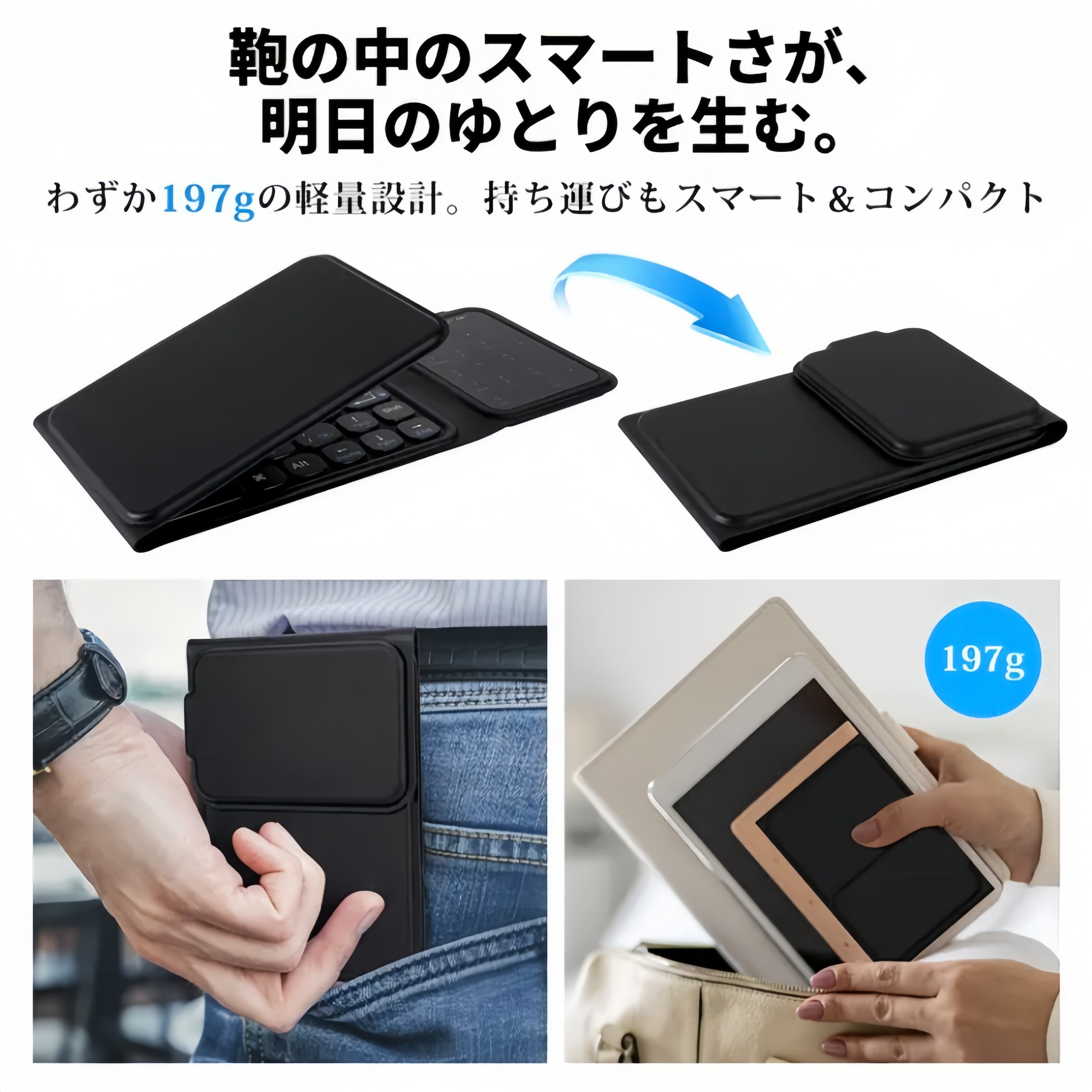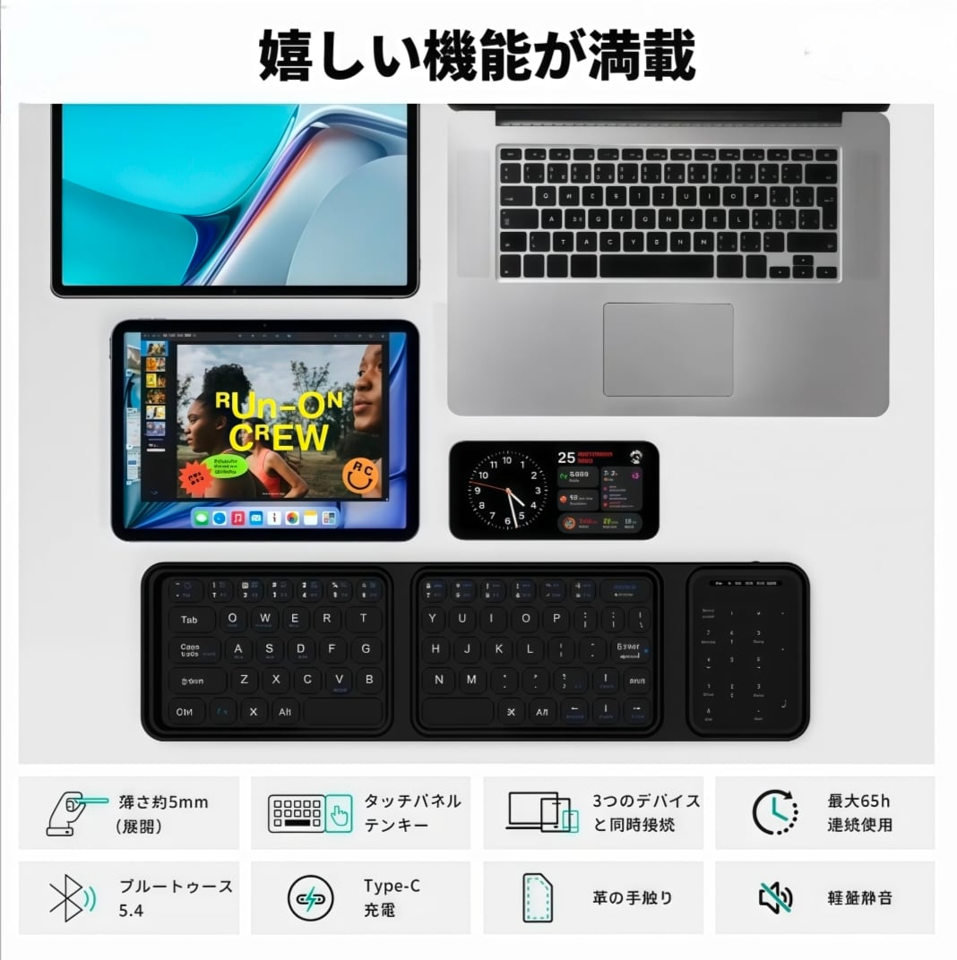 折りたたみ薄型軽量キーボード|iPad・パソコン・タブレット・iPhone対応 タッチパネル&テンキー一体型 ビジネス風PUレザー製、多台マルチペアリング対応 Type-C充電式、静音で打ちやすく、コンパクトで持ち運び便利
