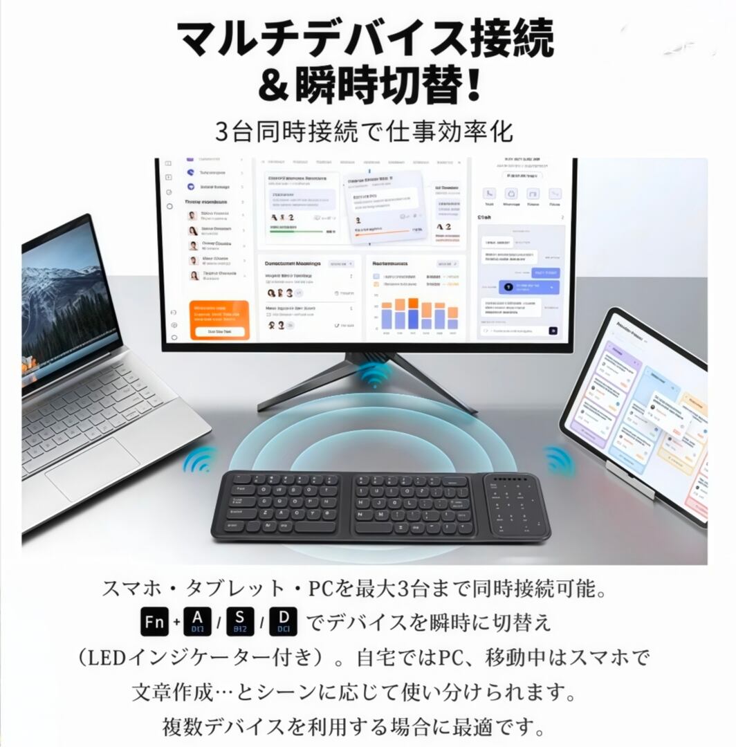 【3台同時接続】オフィスのデスクで「スマホでメッセ一ジ確認 タプレットで資料参照 会社のデスクトッブPCで報告書作成」といった作業を、キ一ボ一ドの切り替え求タン-つでシ-ムレスに行えます。机の上を複数のキ-ボ-ドが占領する 煩わしさから解放されます。