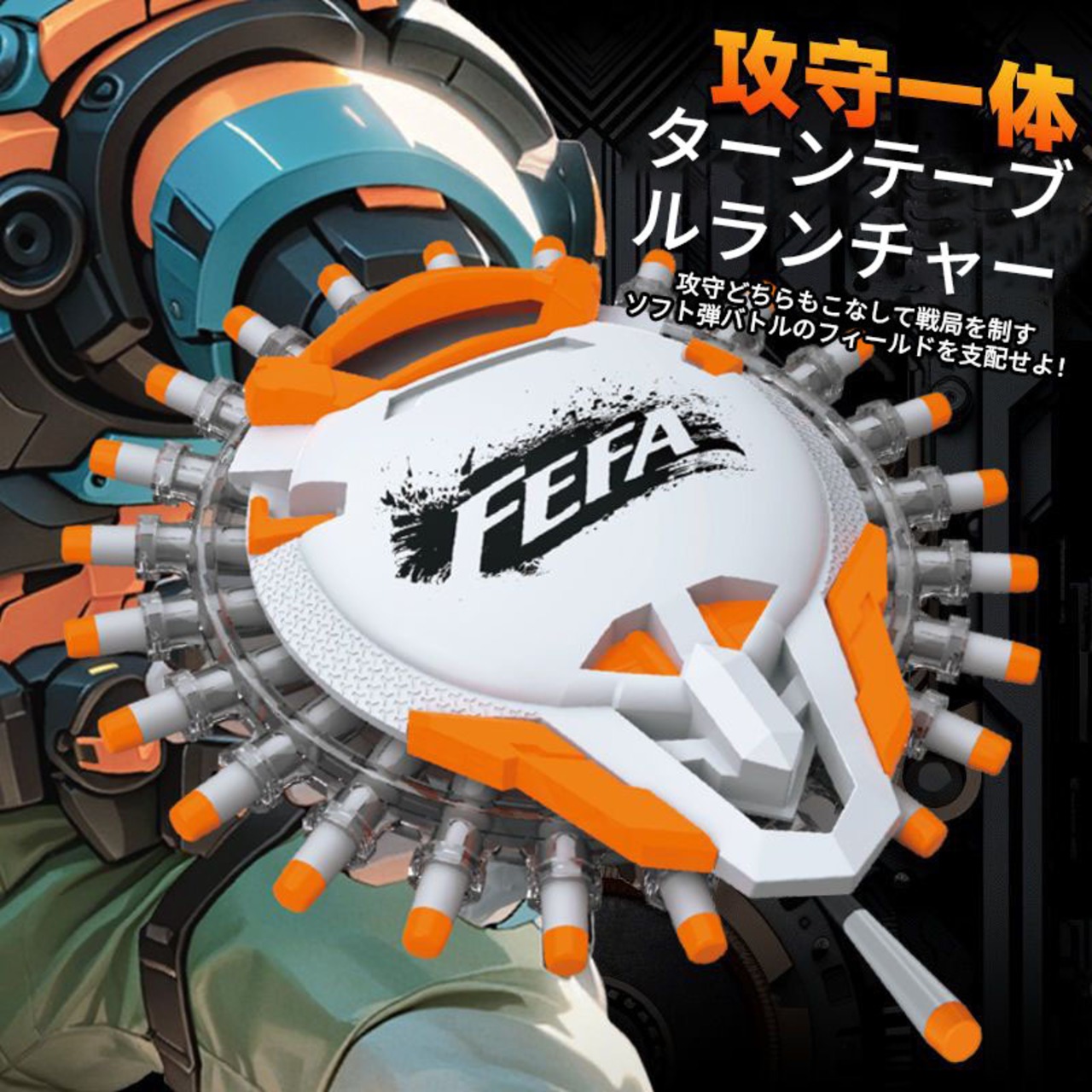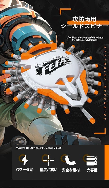 手動で回転するソフト弾シールド発射器で、男の子のヒーローごっこにぴったり!