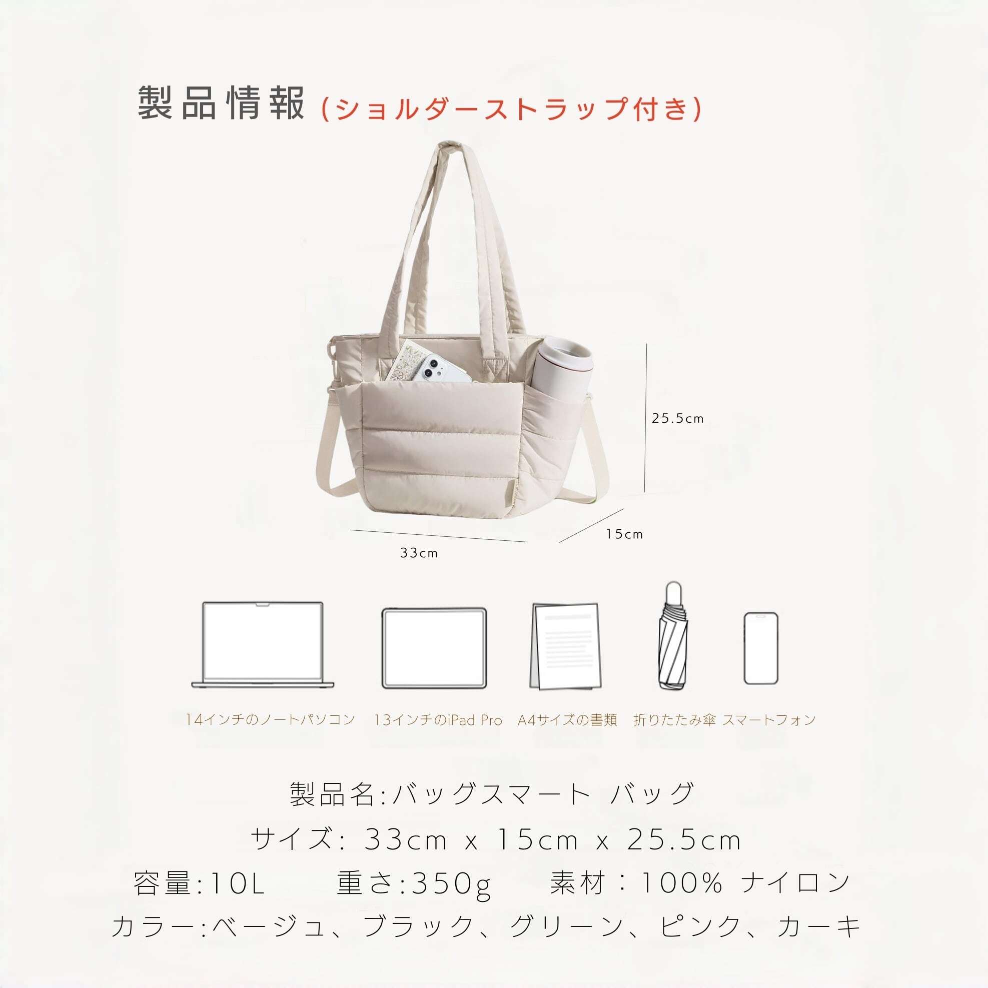 耐久性がありながらも軽量設計で、長時間持っても肩が痛くなりません。通勤や通学、旅行など、あらゆるシーンにぴったりです。