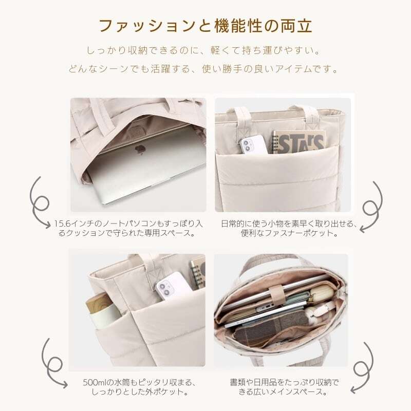 大容量で、ノートパソコンや書類、日常の必需品をすっきり収納でき、整理整頓が楽々。
