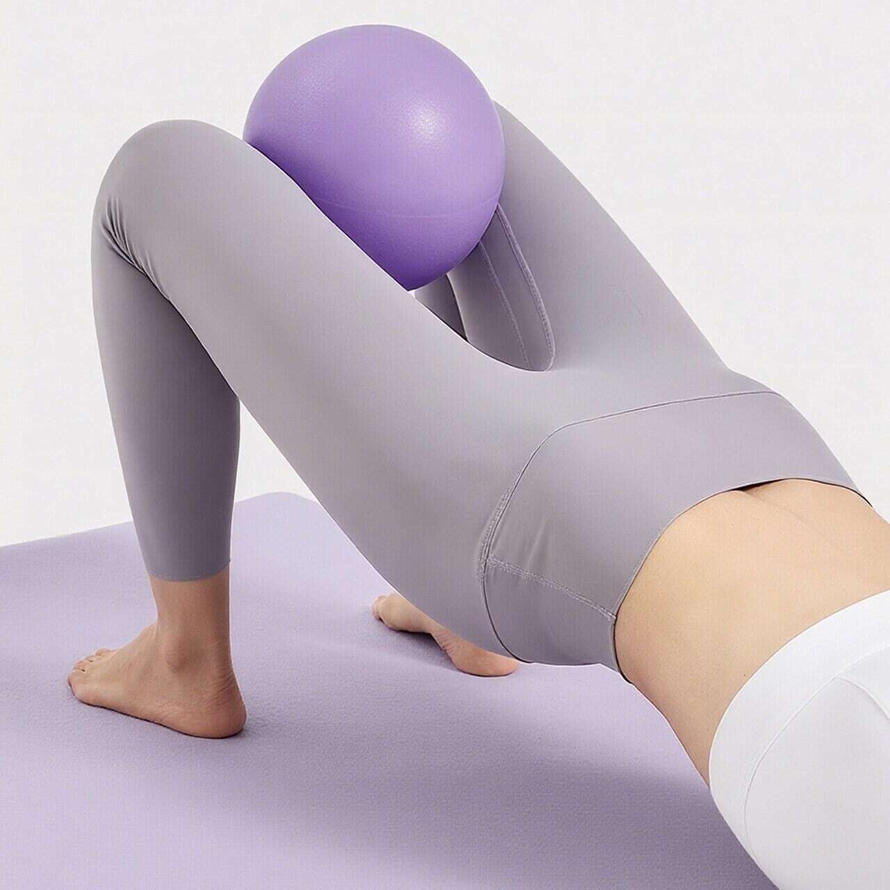→ 仰向けでボールを挟みながらクランチ。腹横筋を優しく引き締め、28日間の継続使用でウエスト-5〜8cmを実感。