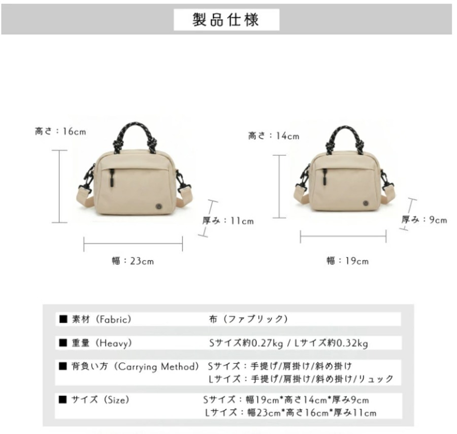 Lサイズは「手提げ・肩掛け・斜め掛け・リュック」の4WAY、Sサイズは「手提げ・肩掛け・斜め掛け」の3WAY に対応。通勤・通学はもちろん、ちょっとしたお出かけから旅行、アウトドアまで、シーンや荷物量、気分に合わせて自由にスタイルを切り替えられる、実用性の高いデザインです。