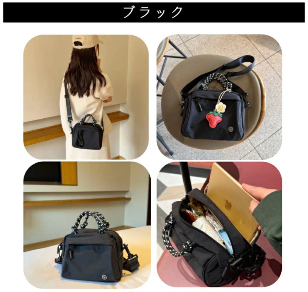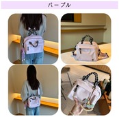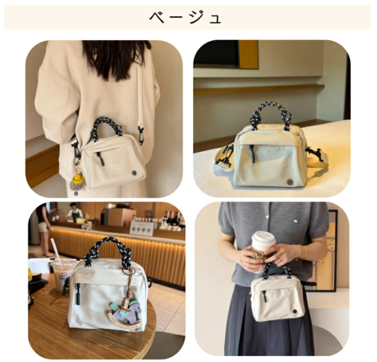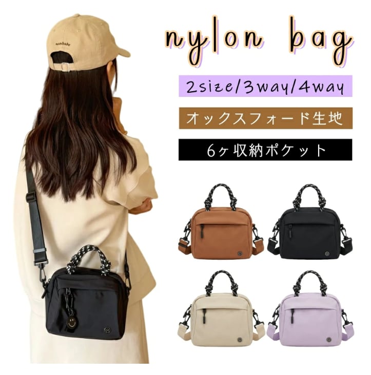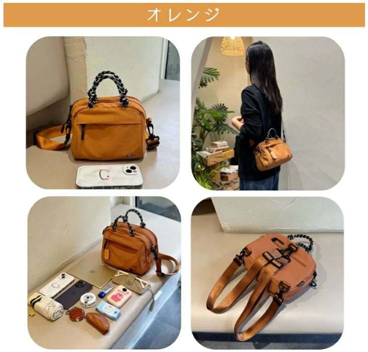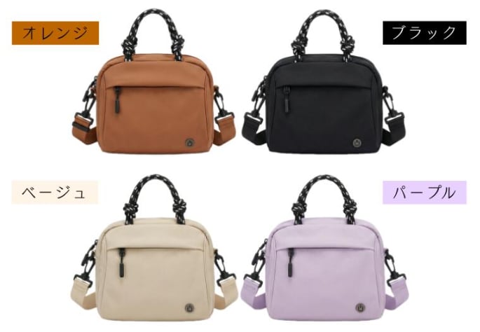 素材には軽量で丈夫な撥水ナイロンを採用。耐久性に優れ、汚れにくく、突然の雨もしのげる安心感があります。カラーバリエーションは、どんなコーディネートにも合わせやすいブラック、元気な印象のオレンジ、ナチュラルなベージュ、落ち着きのあるパープルの4色をご用意。