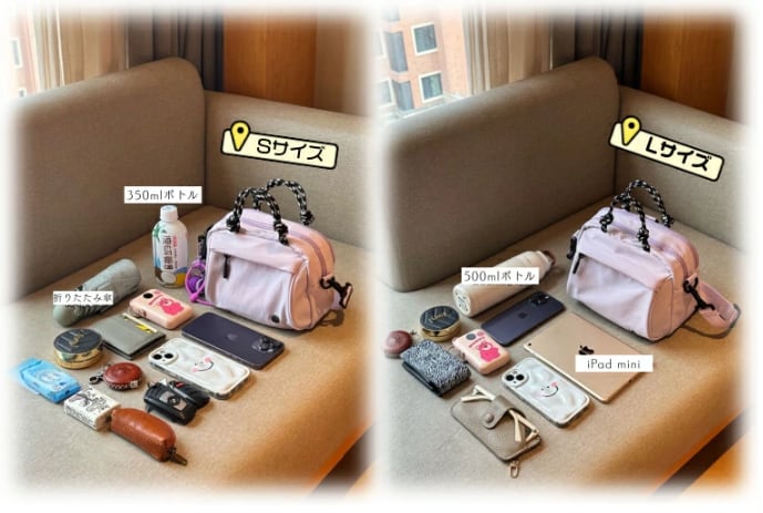 タブレットや書類などもう少し容量が欲しい方にはLサイズ、最小限の荷物で身軽に動きたい方にはSサイズと、ご自身のライフスタイルに合わせてお選びいただけます。