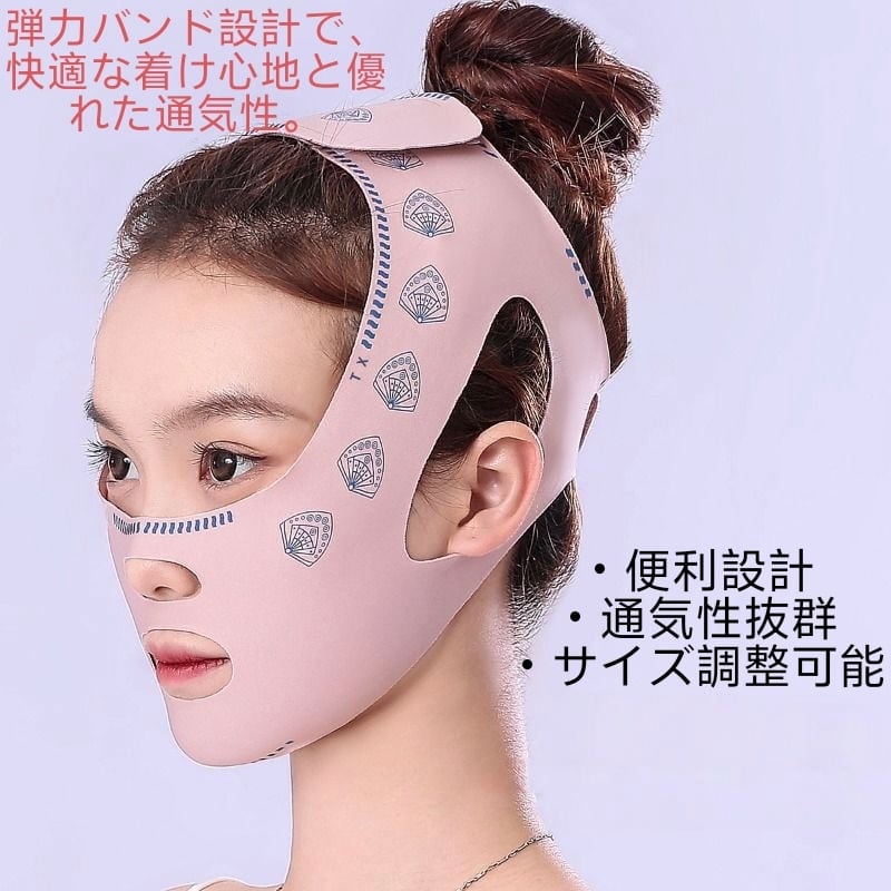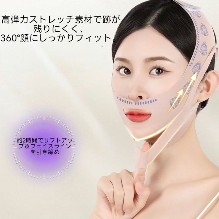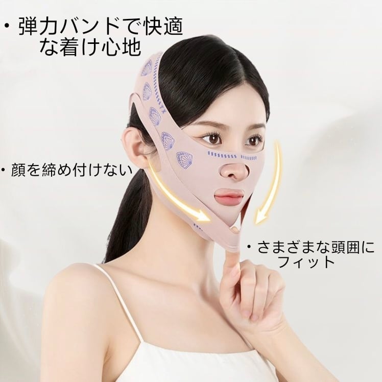 弾力性のある素材と二重リフト設計により、フェイスラインをやさしく引き上げながらしっかりサポート。顔全体を包み込むようにフィットし、頬やあご周りを引き締め、ほうれい線ケアやたるみ対策にも役立ちます。長時間つけても負担が少ない通気性の良い素材を採用しているため、快適な着け心地で自宅ケアが可能です。